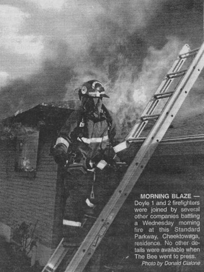 Firefighter Cialone grabbed Doyle No. 1 Assistant Chief Jason Pawlak and together they wrapped the victim in a sheet from an ambulance on location and carried the victim out and on to a waiting AMR stretcher. Firefighter Cialone accompanied the ambulance personnel along with a Cheektowaga Police Officer. The female was delivered alive to ECMC but succumbed to her burns later that night.
